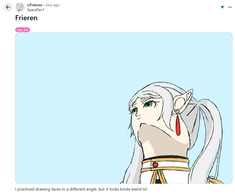 Perhaps you’re familiar with the “Frieren looking up meme.” If you’re not, let me explain. In late 2025, SpaceDev1 posted a fanwork of Frieren from Frieren to the Frieren subreddit. It doesn’t take a fine art degree to see that it’s a little off. Even the artist admits in the post that it came out looking weird. This is the exact situation that stalks the nightmares of someone who thinks people should be ashamed of their mistakes. But the picture immediately exploded in popularity. The voice actress of the character started using the picture as her profile image, professionals, including some who worked on the show, started making tutorials and thousands upon thousands of artists lined up to share their own attempts.