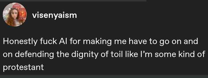 Now I’m here at the end of this thing having an entirely new existential crisis having realized that I’ve fulfilled the prophecy of reinventing protestantism from first principles. You start off talking about art and before you know it you’re preaching about the dignity of toil.